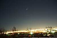 Fyrri myndin er tekin frá Garðabæ yfir hluta Reykjavíkur. Vel má sjá bjarmann, sem liggur eins og hjúpur yfir borginni. Aðeins allra skærustu stjörnur sjást, og Vetrarbrautin sést ekki lengur. Ein bjartasta halastjarna sem sést hefur á síðustu árum prýddi stjörnuhimininn. Mjög erfitt var að ljósmynda hana frá Reykjavík.
