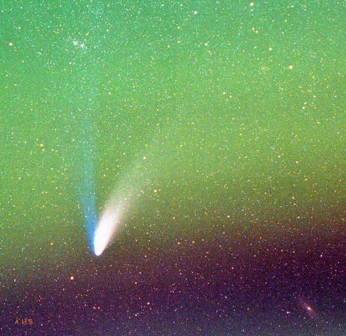 Næsta mynd sýnir Hale-Bopp og aragrúa stjarna. Hér var myrkrið það gott, að hægt var að hafa ljósop myndavélarinnar opið í 10 mínútur. Þá koma fram ótal stjörnur, sem venjulega sjást ekki með berum augum. Einnig má sjá bláan rafhala halastjörnunnar, en hann sést ekki með berum augum. Myndin var tekin frá Keilisnesi, áður en Reykjanesbrautin var lýst upp með illa skermuðum ljósum. Lýsing utanbæjar er sífellt að aukast, og oftar en ekki gleymist að huga að góðri lýsingartækni. Lýsingin veldur óþarfa bjarma, og ekki síður óþarfa glýju.
